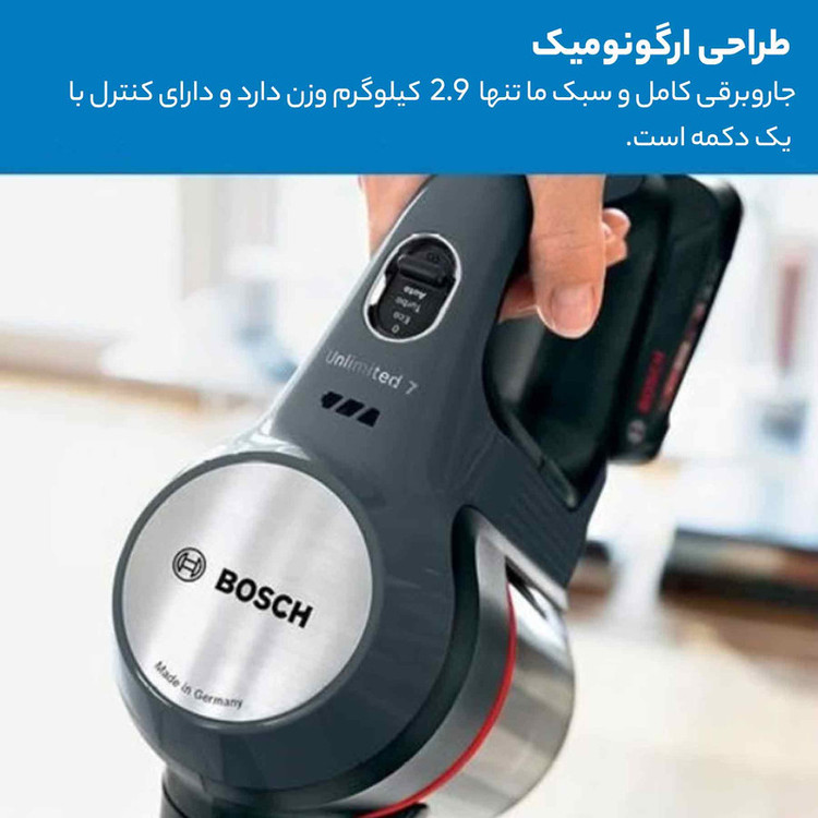 جاروشارژی بوش مدل BCS711GB یکی از پرفروش ترین دستگاه های این برند است که عملکرد آن به دو صورت دستی و ایستاده می باشد. فقط کافی است لوله تلسکوپی را به موتور اصلی وصل کنید و با فشردن دکمه تعبیه شده لوله به صورت 90 درجه در می آید و به راحتی می توانید فضاهای دور از دسترس مانند زیر مبلمان، تخت خواب و . . . را تمیز کنید.
