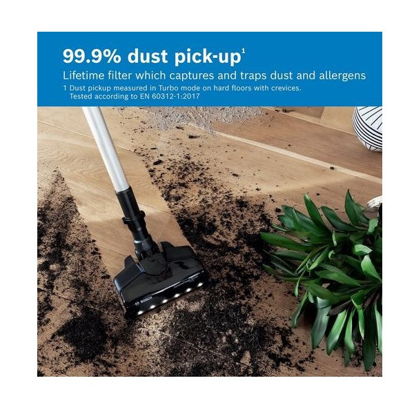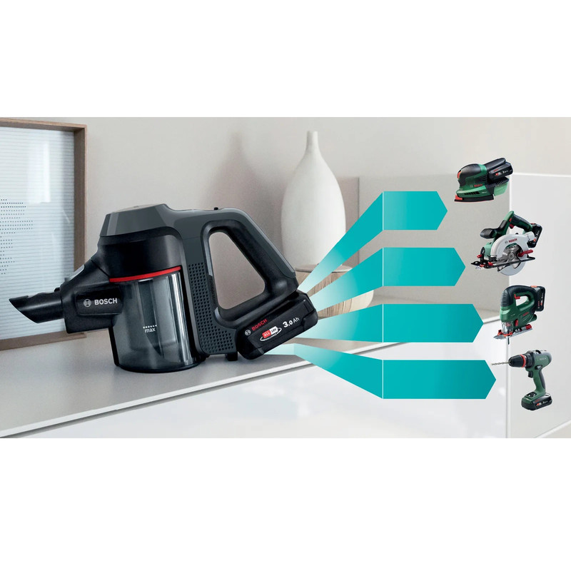 این جاروشارژی مجهز به باتری قدرتمند و بادوام 3.0 Ah بوش است که با استفاده از آن حتی کارهای تمیز کردن سخت را می توانید بدون زحمت انجام دهید. باتری لیتیوم یونی به کار رفته دارای قابلیت شارژ و تعویض است. هم چنین این باتری عملکرد قدرتمند و زمان اجرا طولانی را تضمین می کند. بنابراین می توانید تا 100 متر مربع را تنها با یک بار شارژ باتری بدون وقفه و بدون نگرانی در مورد شارژ مجدد زمان بر تمیز کنید.